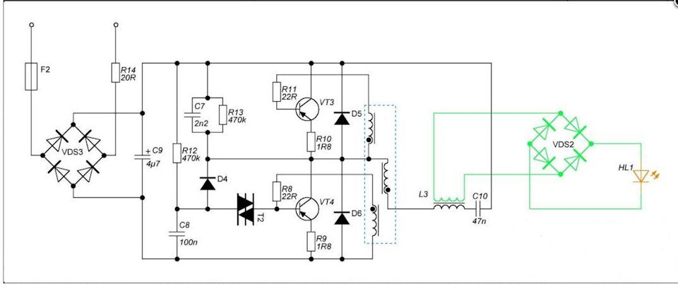 Схема переделанного электронного преобразователя. В результате из дросселя получился трансформатор с подключенным выпрямителем. Зеленым цветом показаны добавленные компоненты.