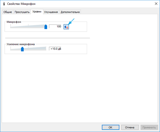Вам нужно просто нажать на микрофон, появится меню, и в разделе «уровни» посмотрите, включена ли полоска так сказать звука. У меня она на 100%, у Вас может быть отключена. Что касается усиления микрофона, то ту все для любителя, если даже 0 дб, из — за это отсутствия звука не будет причиной! Если У Вас все так как у меня, то все работать должно обязательно!