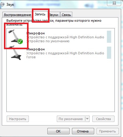 Во вкладке «запись» Вы можете посмотреть подключенные звуковые устройства, а именно микрофон. У меня микрофон как видите включен, и если что — либо скажу, то рядом шкала поднимется зеленым цветом вверх. У меня 2 микрофона, первый встроенный в ноутбук, а сейчас используется как раз внешний микрофон, который подключен через внешнюю отдельную звуковую карту.